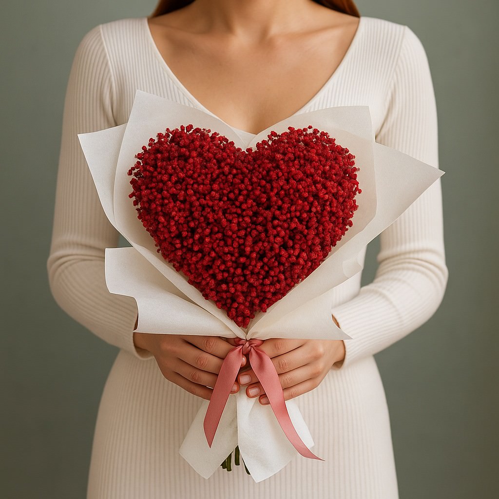Уникальный букет из гипсофилы, собранный в виде сердца, станет ярким признанием в чувствах. Этот нежный и трогательный подарок расскажет о вашей любви без слов, оставив в сердце получателя самые теплые эмоции.