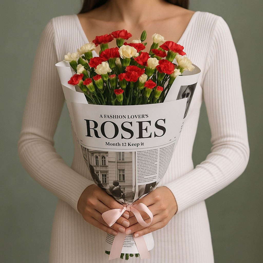 Очаровательный букет из кустовых гвоздик в стильной газетной упаковке — это воплощение легкости, шарма и французского настроения. Он наполняет пространство свежестью, создавая атмосферу уюта и романтики. Такой букет станет отличным подарком для выражения искренних чувств, благодарности или просто хорошего настроения.