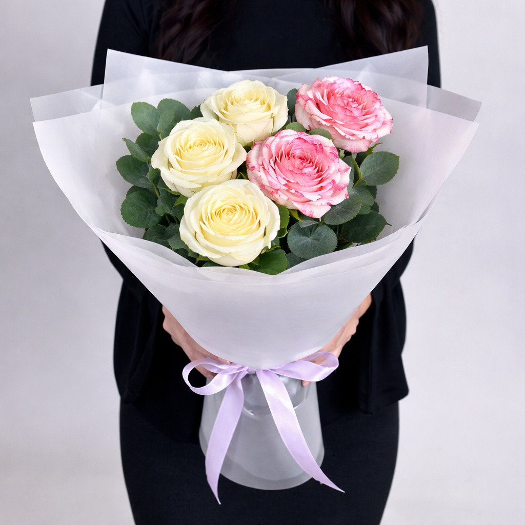 Элегантный букет из пяти роз — это утончённое сочетание нежности и выразительности. Светлые кремово-белые бутоны гармонично дополняются розовыми розами с изящной каймой, создавая ощущение тепла, заботы и искренних чувств. Лёгкая упаковка и аккуратная атласная лента подчёркивают воздушность композиции, делая букет универсальным подарком для признания, благодарности или трогательного знака внимания.