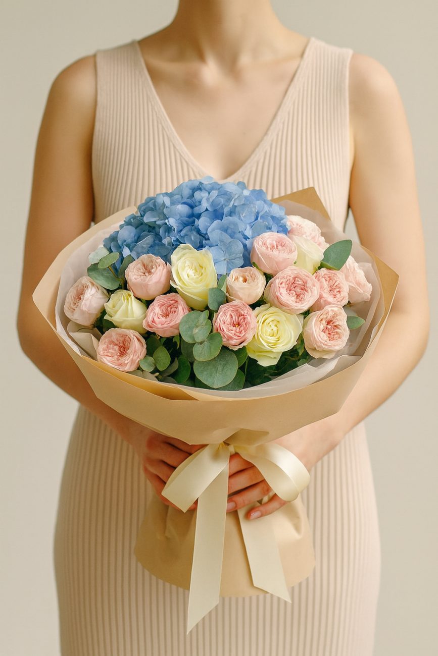 Элегантный букет в нежных пастельных тонах: бархатистые розы и выразительная голубая гортензия создают гармоничную, живую композицию для любого повода.
