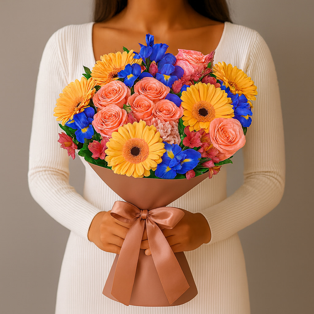 Изящная композиция в акварельных оттенках: персиковые герберы, нежные розовые розы и яркие синие ирисы создают гармоничный контраст. Этот букет наполнен лёгкостью и вдохновением, он станет прекрасным подарком для выражения самых искренних чувств.