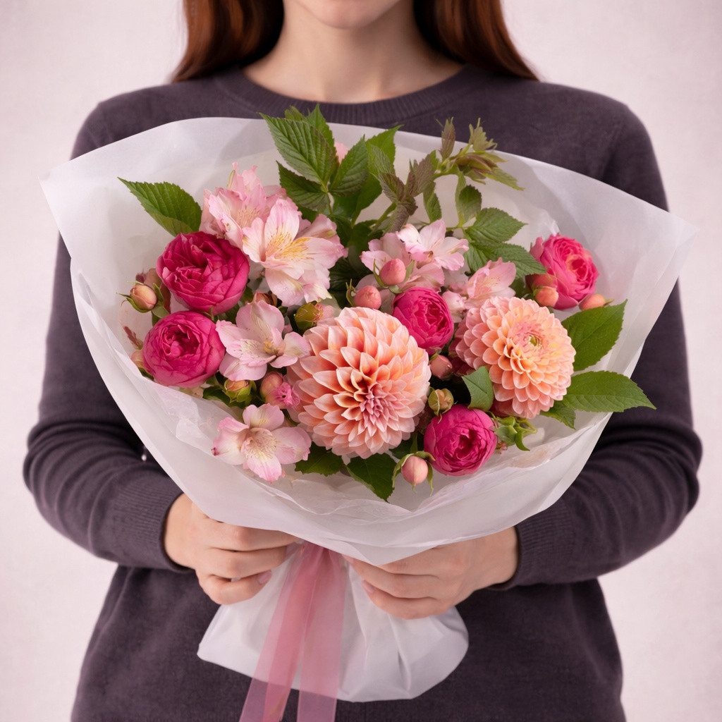 | Состав: | Альстромерии, Георгины, Кустовые розы |