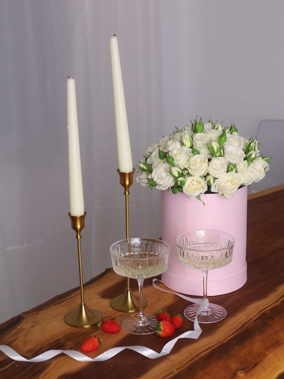 Коробка «Вечер при свечах» - букет, который отличается уникальной эстетикой, созданной за счет стиля и цветовой гаммы